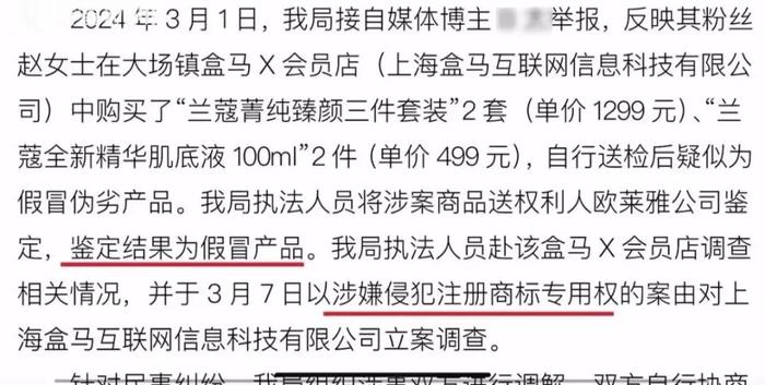 近日,盒马被爆售卖大牌假货的新闻冲上热搜。有投诉平台显示,仅今年2月以来,就有300条同类投诉。上海市宝山区市场监督管理局针对其中一项消费者投诉表示:涉案商品送权利人欧莱雅公司鉴定,鉴定结果为假冒产品,监管部门以涉嫌侵犯注册商品专用权案由,对上海盒马互联网信息科技有限公司立案调查。目前调查中发现,化妆品是由注册在浦东的盒马物联网有限公司向全国盒马X会员店统一供货。相关线索也已移送浦东新区相关部门。上海警方已介入并立案调查,目前已抓获部分涉嫌销售假冒注册商标的商品罪的嫌疑人。